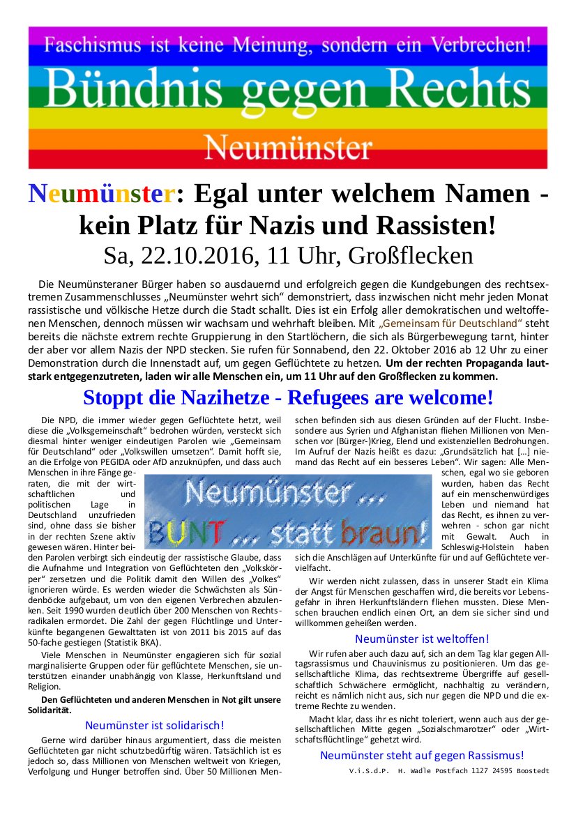 #NMS2210 Neben dem autonomen Aufruf („Den Nazis den Tag verhageln“) gibt es jetzt einen Aufruf des Neumünsteraner Bündnis gegen Rechts (BgR, siehe http://www.nms-bunt-statt-braun.de/presseaktuell.html) und der Landesschüler*innenvertretung der Gemeinschaftsschulen Schleswig-Holstein (LSV, siehe http://tinyurl.com/jbbwr4j): „Egal unter welchem Namen – kein Platz für Nazis und Rassisten“, 11 Uhr Großflecken.